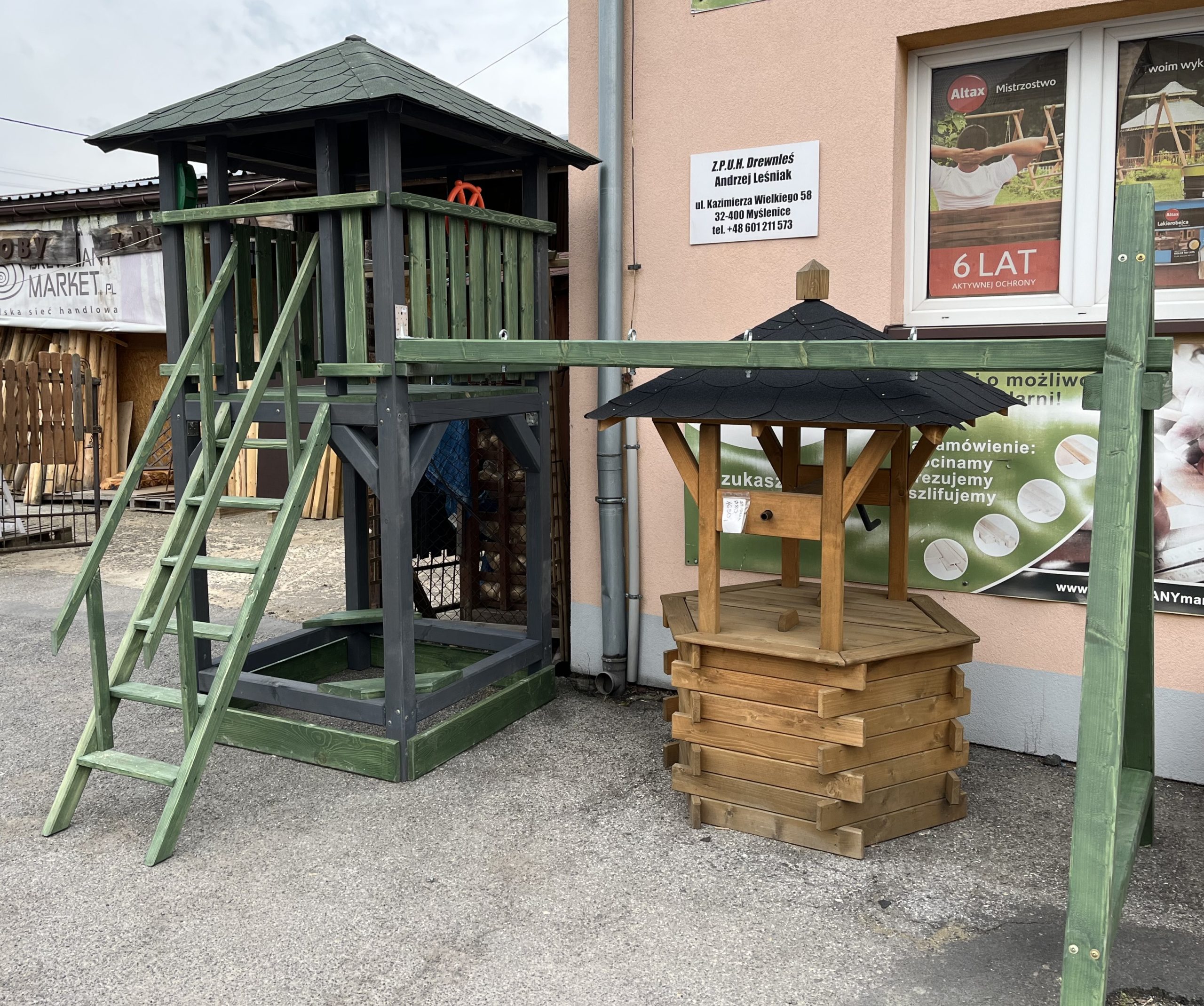 Dodatkowe informacje: W zestawie piaskownia, zjeżdżalnia, huśtawki, telefon zabawka, luneta, kierownica, skrzynka na listy (możliwość wyboru)